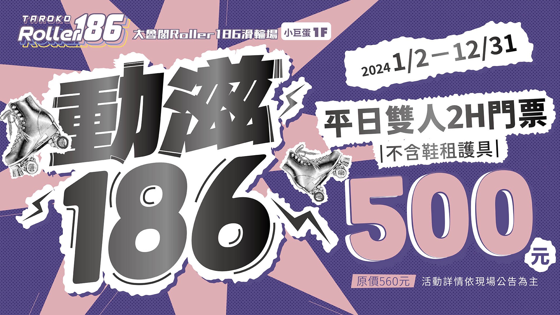 持動滋券,至大魯閣Roller186滑輪場 新時代館、南紡館,即享『平日雙人2H門票(含鞋租+護具)500元』 (原價660元)