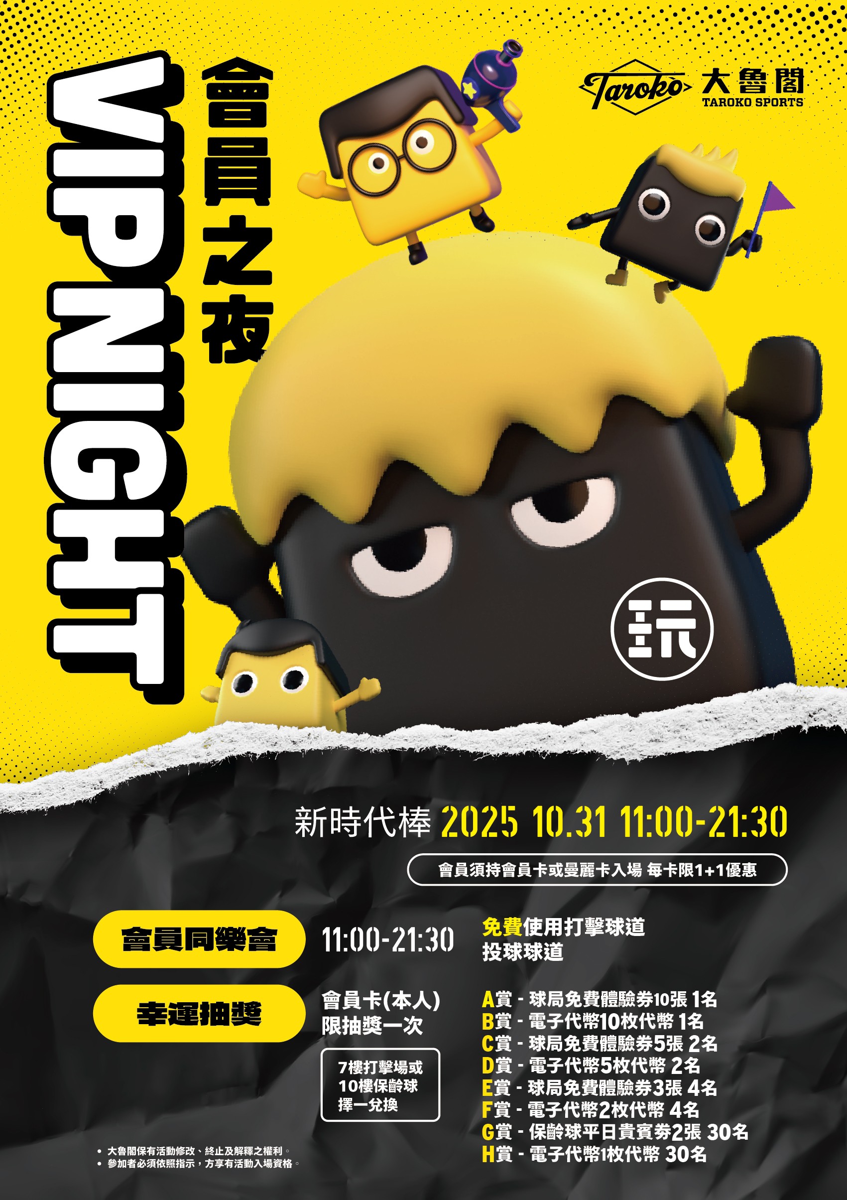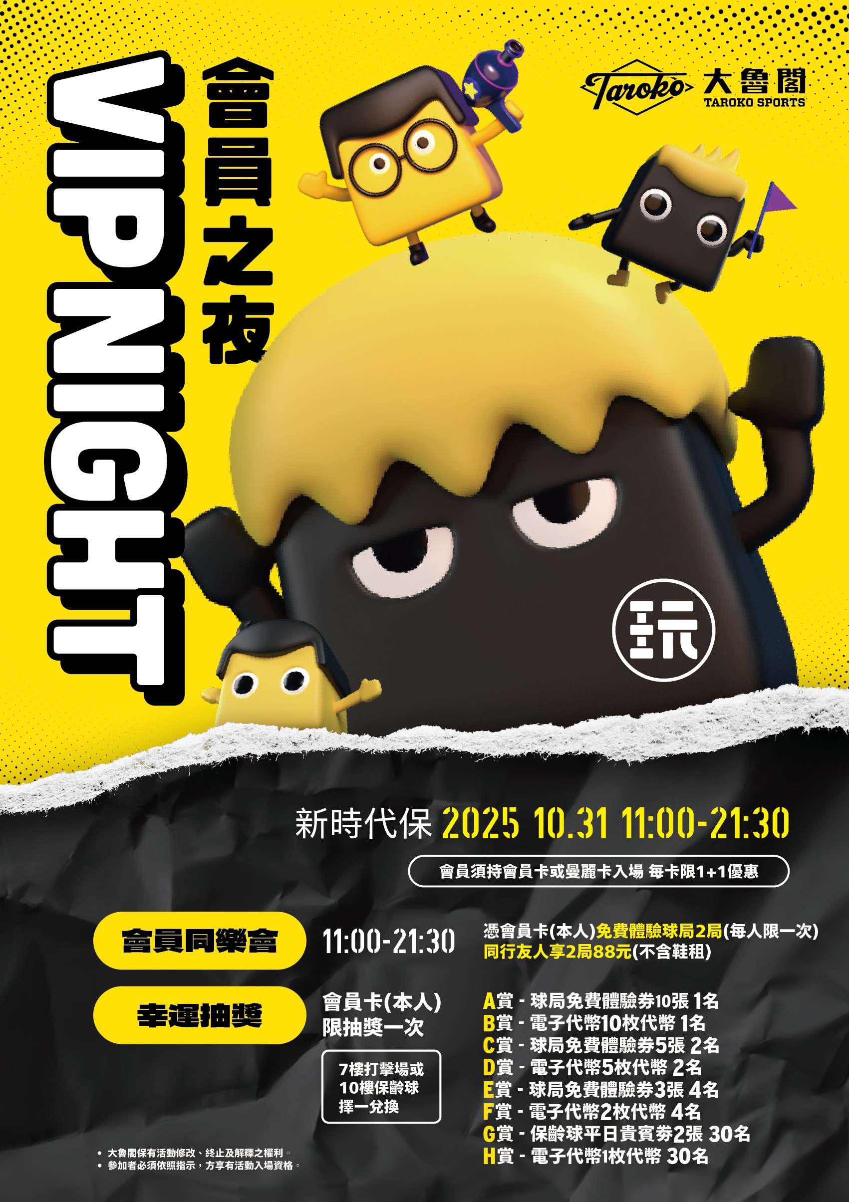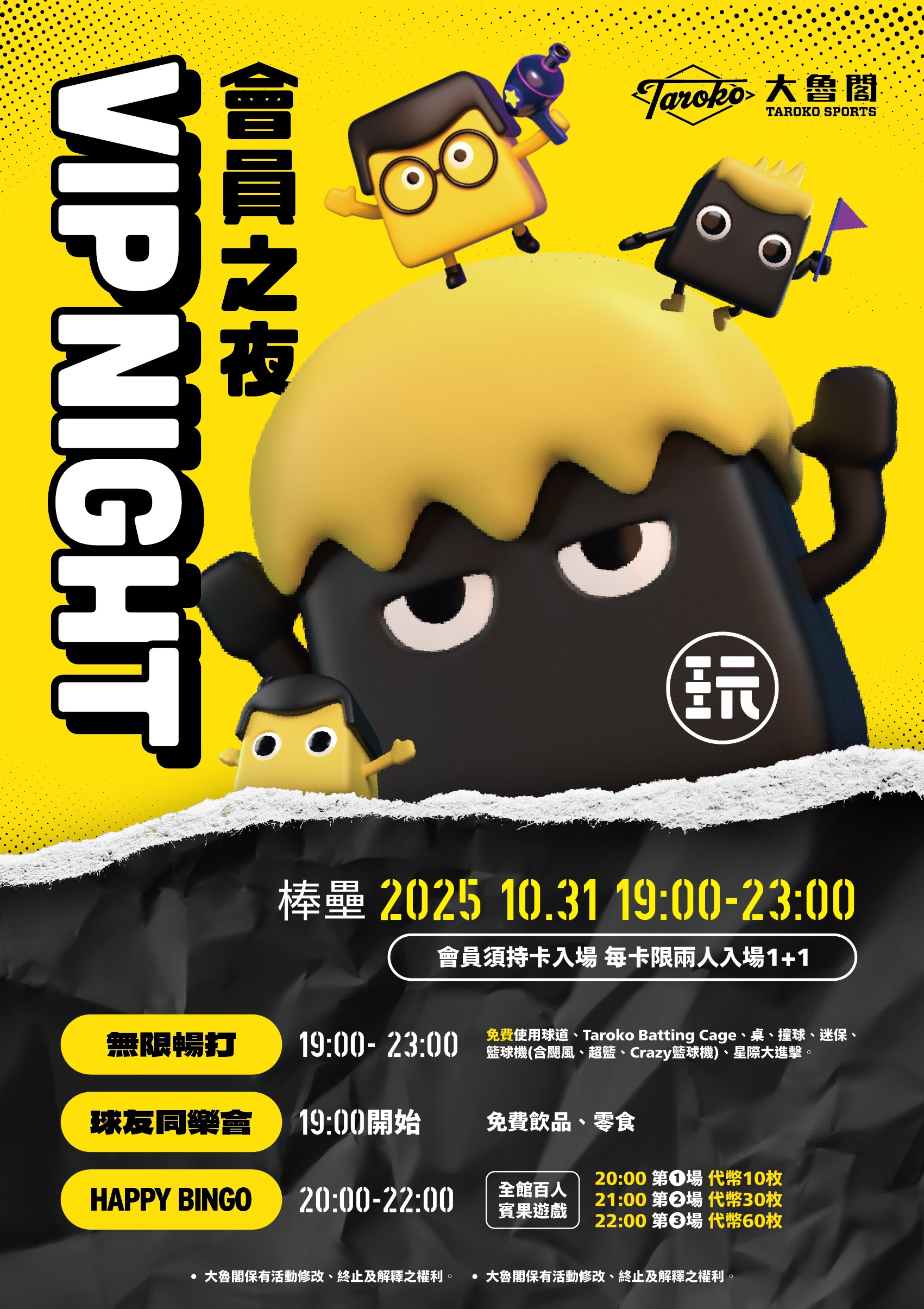 此外,10/31(五)VIP會員之夜 也將於全台棒壘球館同步登場,