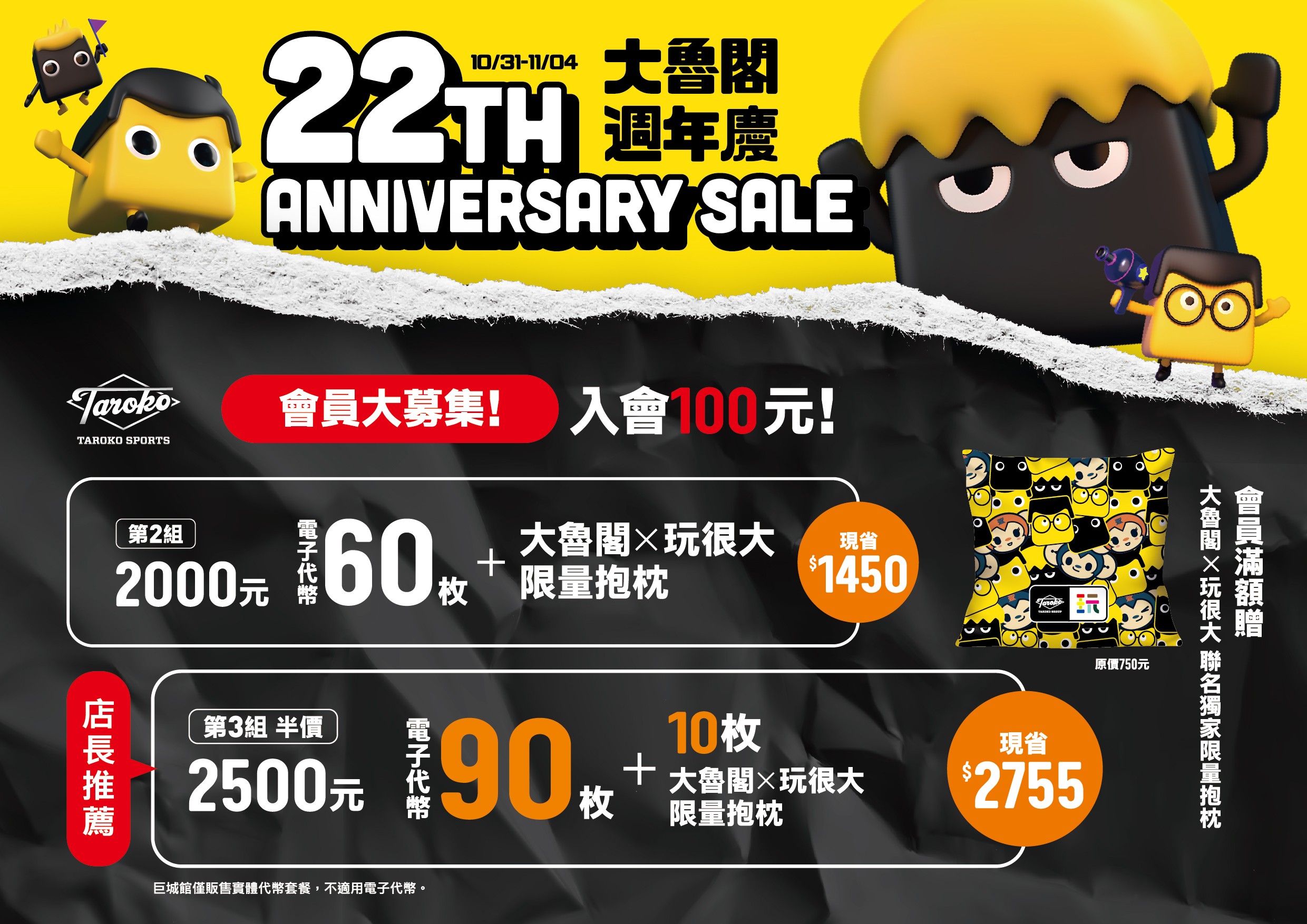 ²週年慶限定,會員代幣第3組半價☆首五日(10/31-11/4)加贈10枚代幣!單筆消費2組以上會員代幣,加贈大魯閣x玩很大 獨家限量抱枕 (原價750元)!
