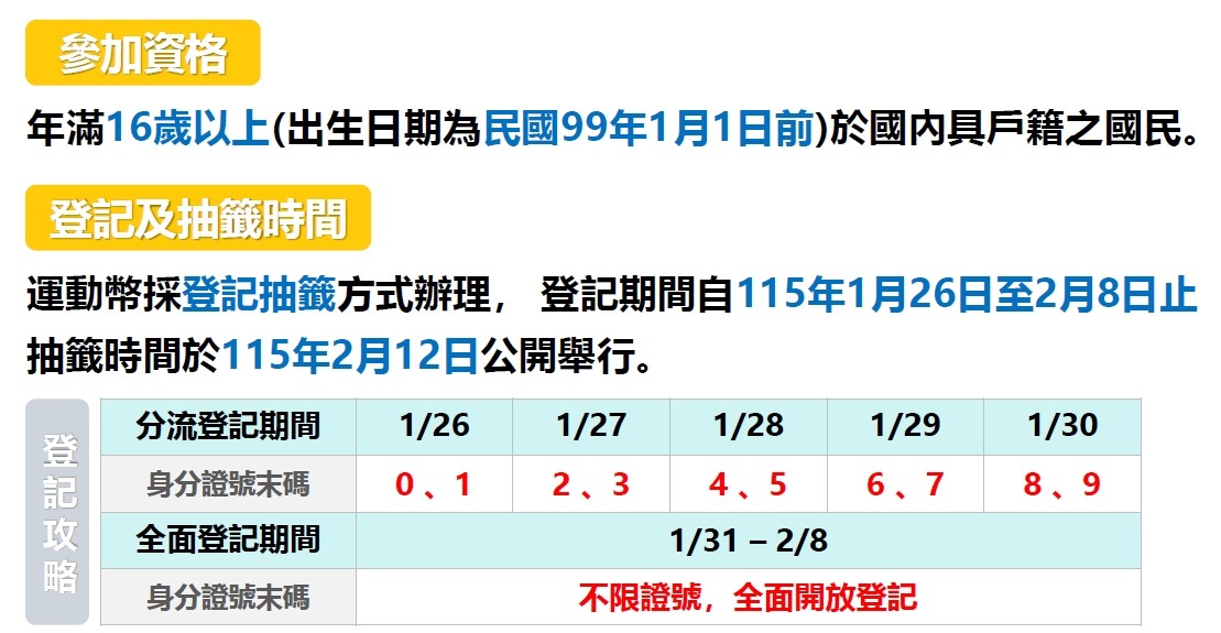 登記期間:115 年 1 月 26 日 – 2 月 8 日