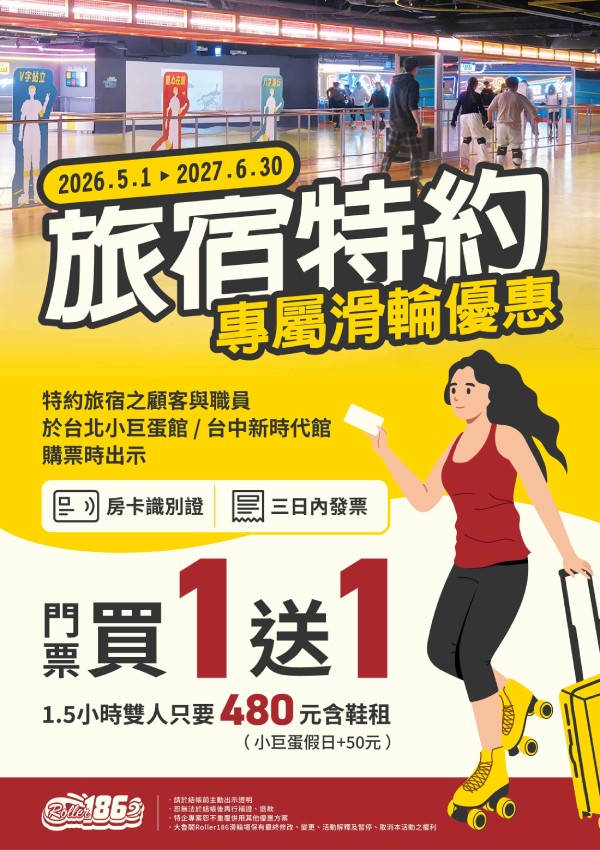 Roller186旅宿特約商店正在熱烈招募中,誠摯邀請旅宿業者加入!享旅宿專屬1.5小時門票買一送一優惠! 活動內容如下