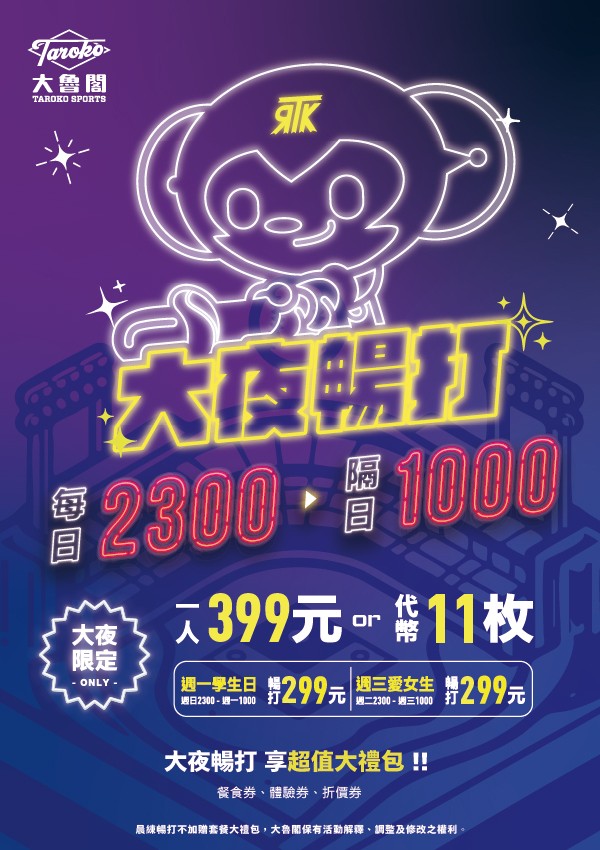 大夜時段只要 399元 或 代幣11枚,棒壘球打擊區/棒球投球機/迷你保齡球/超級籃球機/Rookie籃球機/颶風籃球機,設備享無限暢玩!