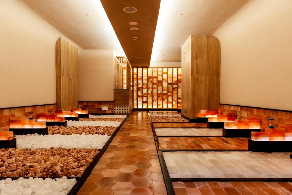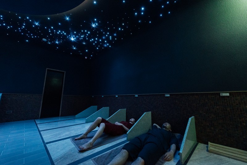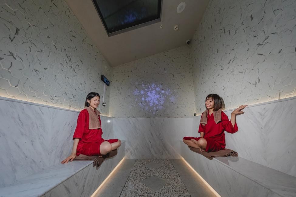 每間岩盤浴房都搭配加熱中的天然礦石或是岩板,加上空間的色調與溫度,一次滿足排汗、美膚、新陳代謝等效果,浴房的溫度大多落在40-60度C之間,可以根據不同浴房的石材特性,淨化身心,像是鳳綠岩盤浴建議可以站起來伸展身體;赤塩岩盤浴則主打躺在喜馬拉雅山玫瑰鹽的岩塊上,若是女生剛好生理期來,可以直接將石塊熱敷在腰間減緩不適;最令人驚豔的墨夜岩盤浴則打造星空空間,設計神黑石與帝諾大理石的岩面,靜靜躺下,看著天花板的閃爍星空十分紓壓;芬蘭浴則是將水灑在加熱的岩石上,使水蒸氣和熱波沸騰,感知溫度立即升高,刺激人類的交感神經,促進血液循環並促進出汗,這間也是館內最高溫的浴房,可高達約70-80度C左右;至於映雪冷卻房的部分則是使用降雪機在房內降下雪花,氣溫保持在15度,讓大家經過加熱後低溫冷卻收縮毛孔、活化肌膚。